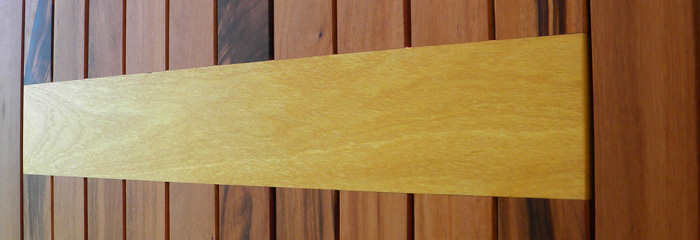 A close-up detail view of the Garapa accent bridge. The bridge contains twenty 50mm internal Mahogany tenons to support the tabletop.